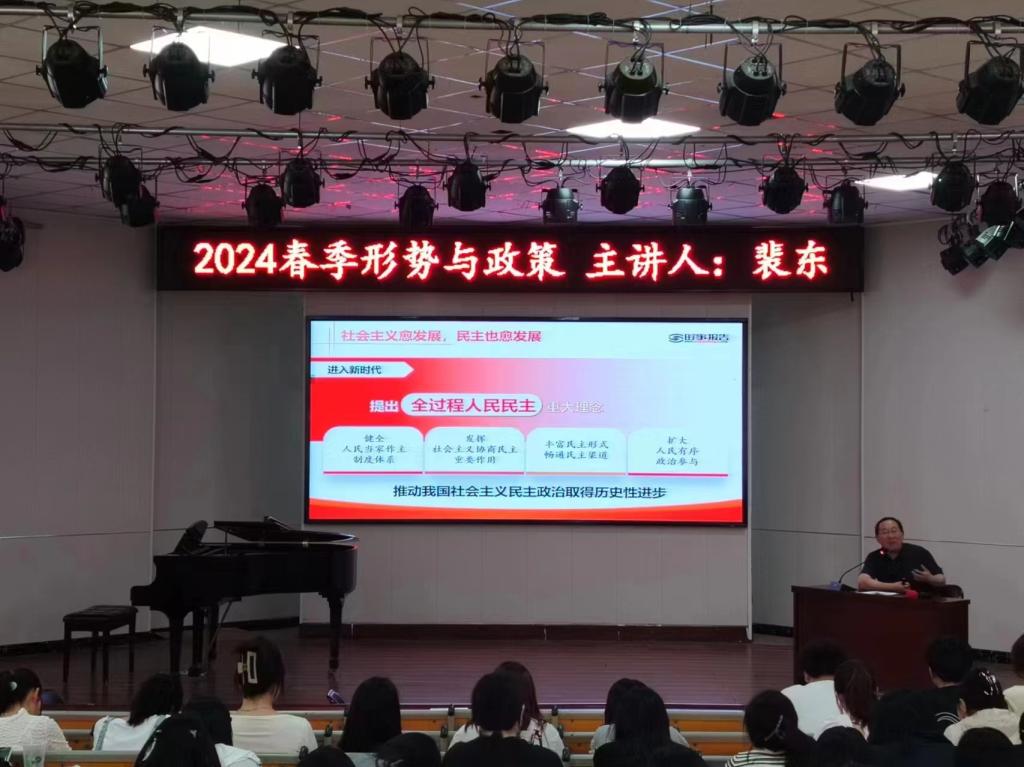 本次线下教学以教育部《关于做好2024年春季学期全国高校“形势与政策”教学工作的通知》为依据,深入贯彻落实党的二十大和二十届二中全会精神,结合中宣部、教育部联合举办的全国高校“形势与政策”集体备课会优质资源,为学生重点讲授党和国家在“全过程人民民主”和“铸牢中华民族共同体意识”方面的政策和形势,引导学生紧跟时代步伐,坚定不移听党话、跟党走,努力成长为堪当强国建设、民族复兴重任的时代新人。