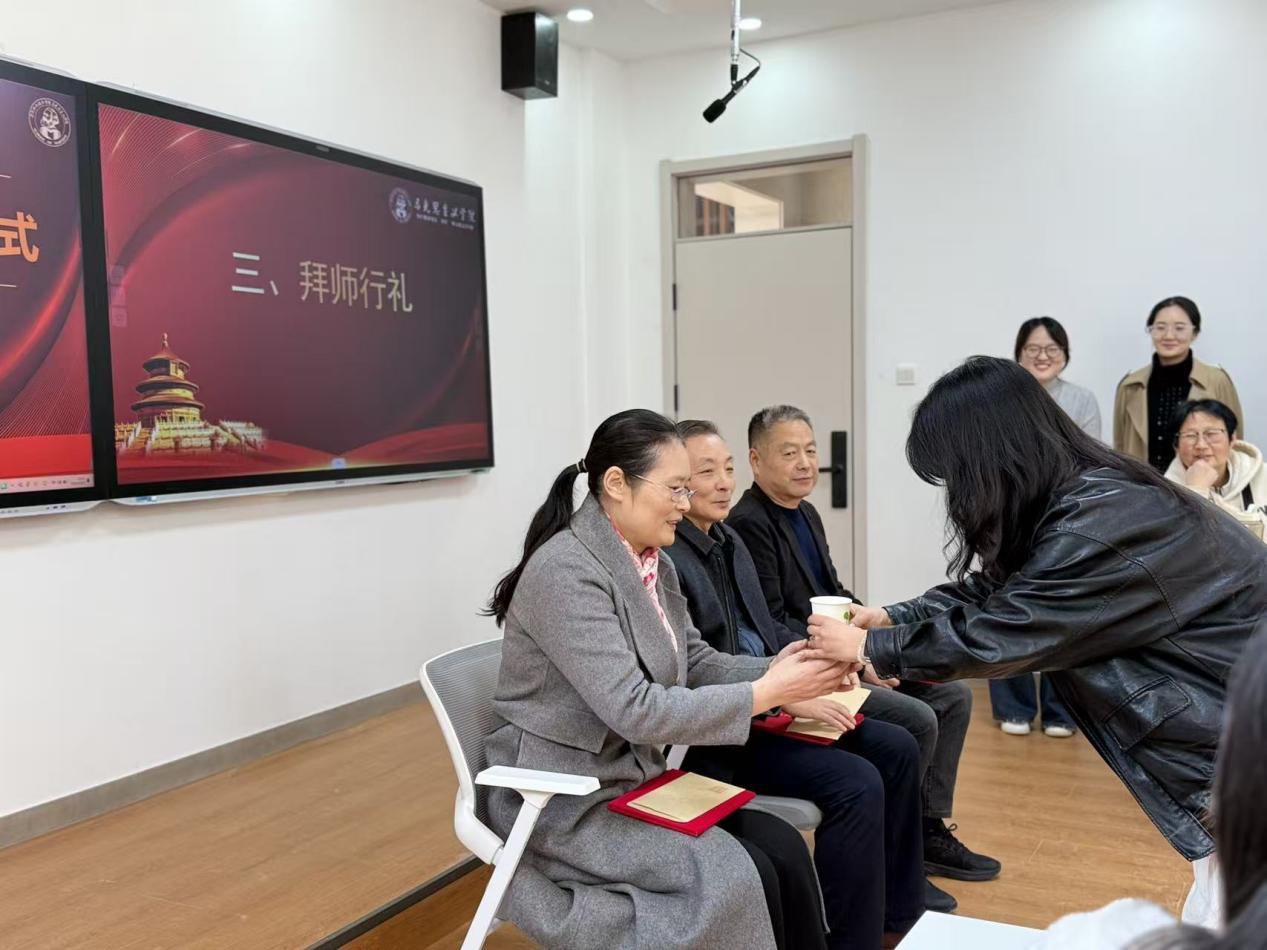 在庄重而温馨的氛围中,三位新进教师登台与导师面对面站立。新进教师向导师躬身行拜师礼、敬献暖心茶,以传统礼仪表达对导师的崇高敬意与感恩之情;导师则回赠亲笔书信,寄予殷切勉励。师徒双双合影,定格下这一重要时刻。这一典雅而肃穆的环节,不仅是教学智慧的接力,更是育人使命的传承。