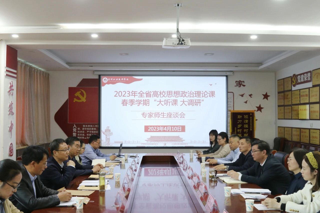 现场听课结束后,调研组和师生代表在行政楼会议室召开座谈会。座谈会上,党委书记易军鹏向调研组一行的到来表示热烈欢迎,他表示,校党委高度重视思政课建设,学校坚持“三个第一”理念,贯彻党委书记联系马院的原则,落实“领导班子带头上思政课”制度,拓展思想政治教育社会实践基地,在思政课教学中讲好专业故事、讲好本地故事,将思政课理论与实践相结合。党委委员、副院长程传蕊参会致词并对学校概况进行了简单介绍。思想政治理论部石俊霞主任就思政课开设、集体备课、教师授课、实践教学、努力方向进行了汇报。