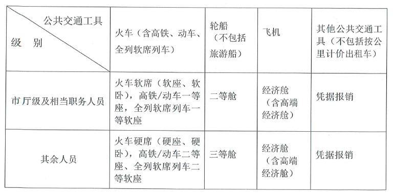第十三条 出差人员应当按规定等级乘坐公共交通工具。乘坐公共交通工具的等级见下表: