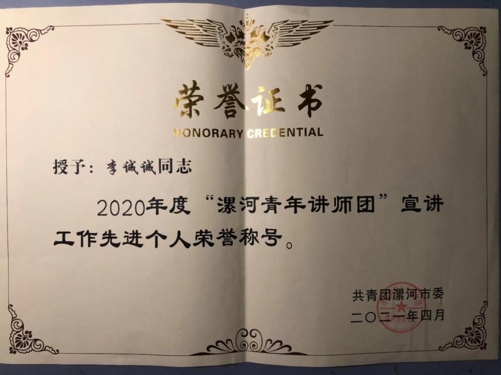 思想政治理论部李诚诚、郭亦佳老师荣获“2021年度漯河青年讲师团宣讲工作先进个人”称号。