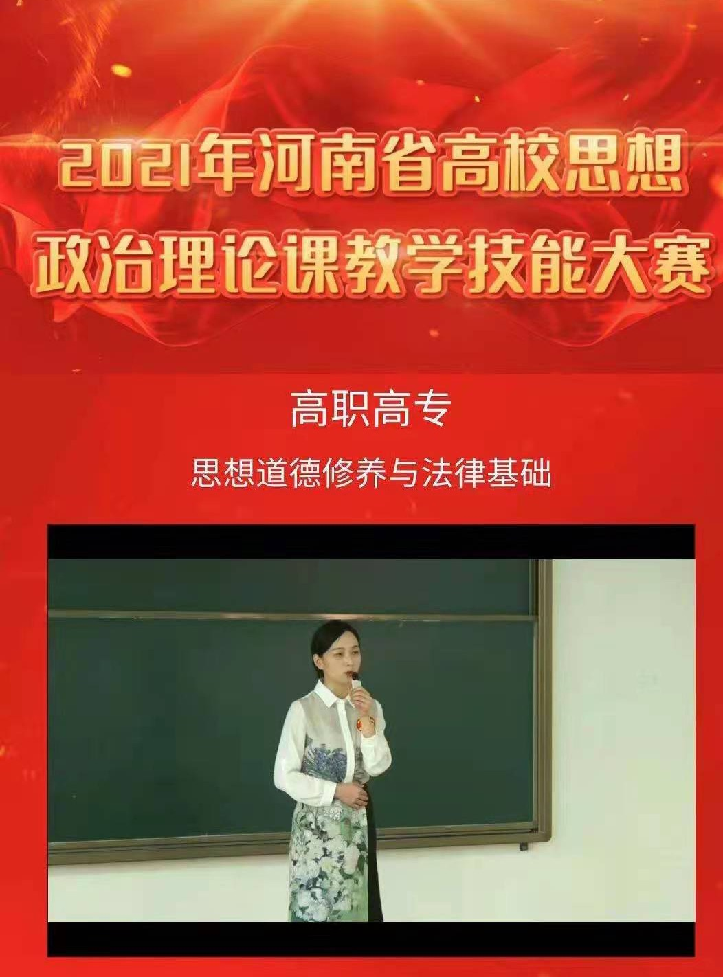 近日,2021年河南省高校思想政治理论课教师教学技能大赛上,bat365官网思政部老师李迎安老师荣获“毛泽东思想和中国特色社会主义理论体系概论”课特等奖,郭亦佳老师荣获“思想道德修养与法律基础”课一等奖,这是bat365官网继李诚诚老师荣获河南省高校思想政治理论课教师教学技能大赛特等奖、首届全国高校思想政治理论课教学展示活动一等奖之后取得又一标志性成果。