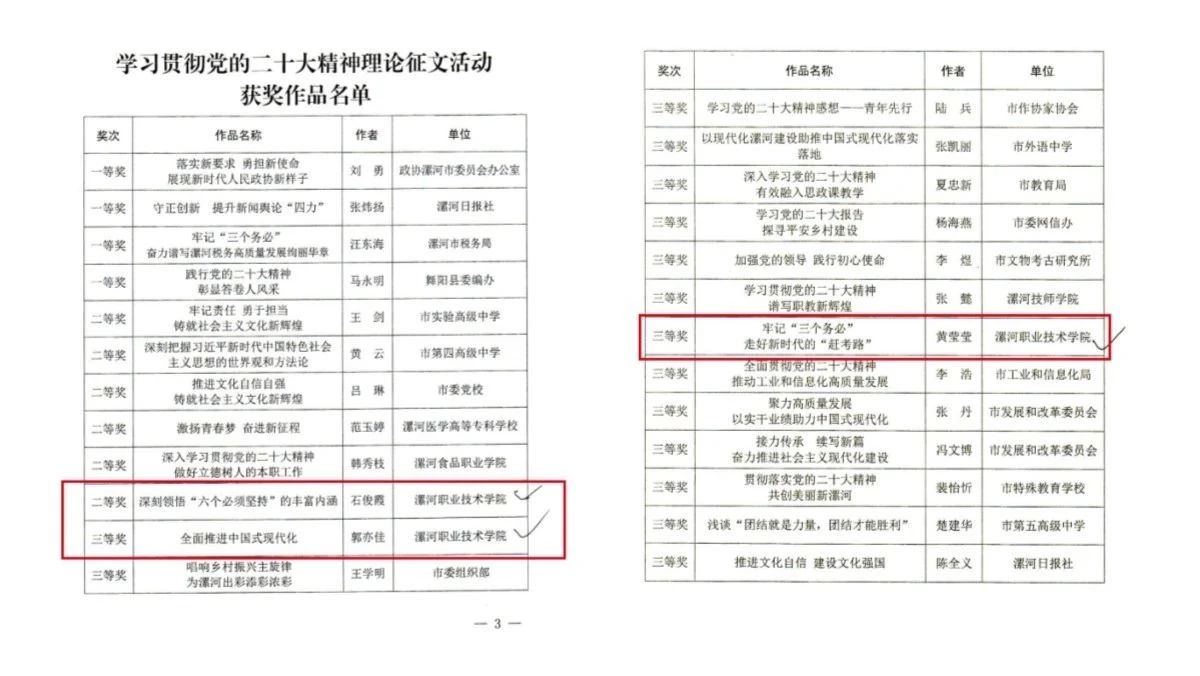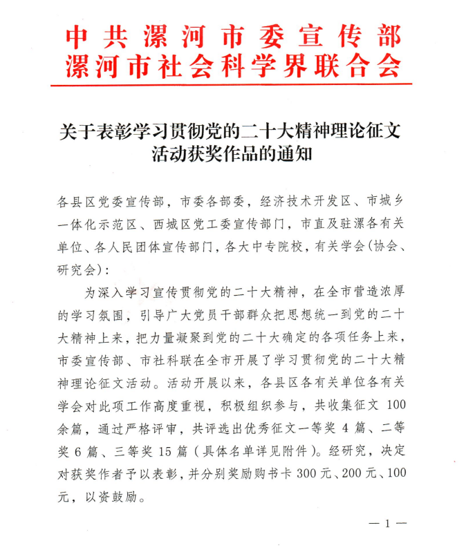 近日,中共漯河市委宣传部、漯河市社会科学界联合会下发《关于表彰学习贯彻党的二十大精神理论征文活动获奖作品的通知》,bat365官网思想政治理论部主任石俊霞作品《深刻领悟“六个必须坚持”的丰富内涵》荣获二等奖,思政课教师郭亦佳、黄莹莹作品《全面推进中国式现代化》、《牢记“三个务必”走好新时代的“赶考路”》荣获三等奖。