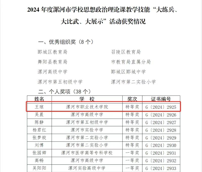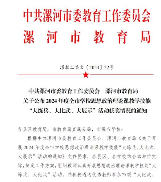近日,中共漯河市委教育工作委员会、漯河市教育局公布了2024年度全市学校思想政治理论课教学技能"大练兵、大比武、大展示"活动获奖情况,bat365在线中国官网登录入口bat365在线中国官网登录入口王琼、李果两位教师分别荣获特等奖和二等奖。